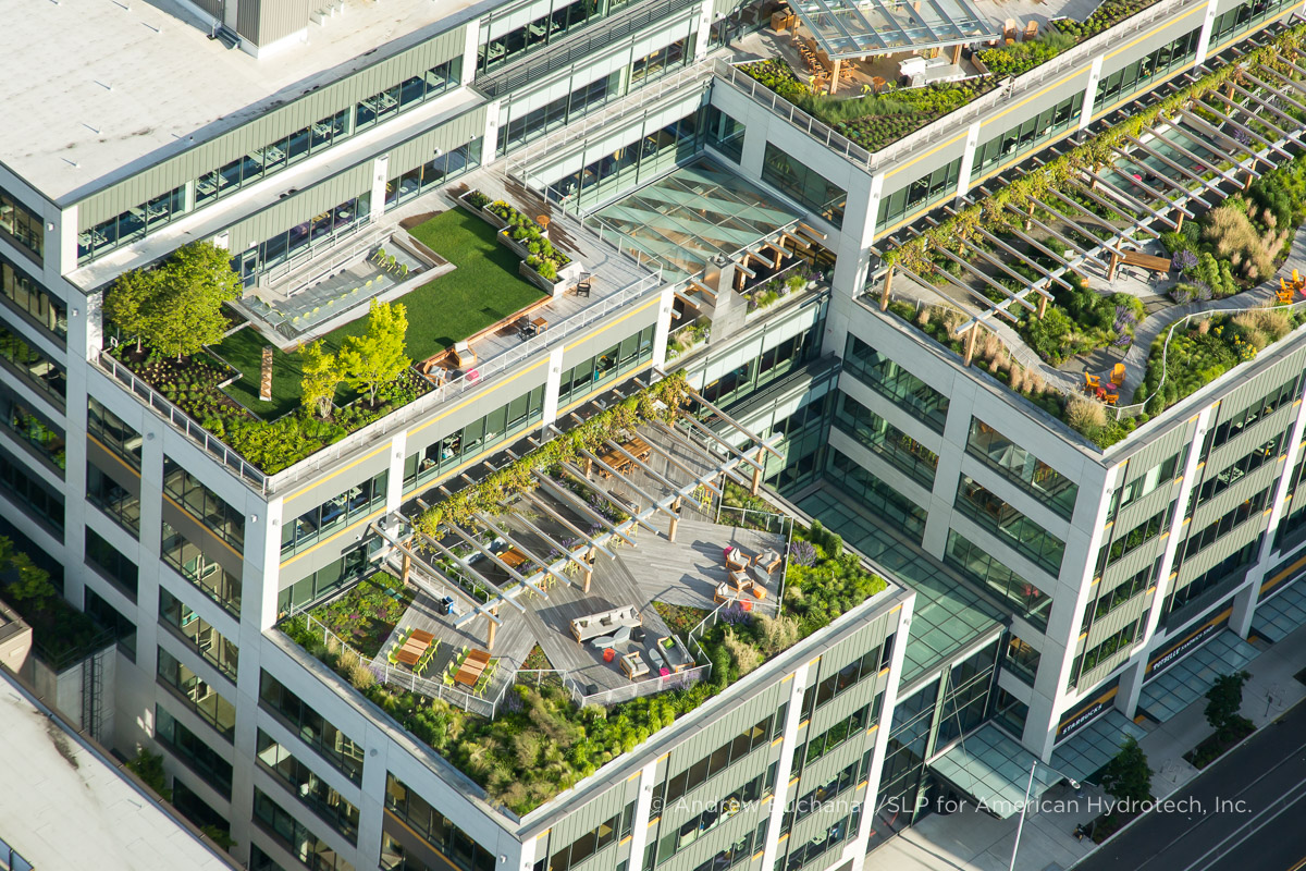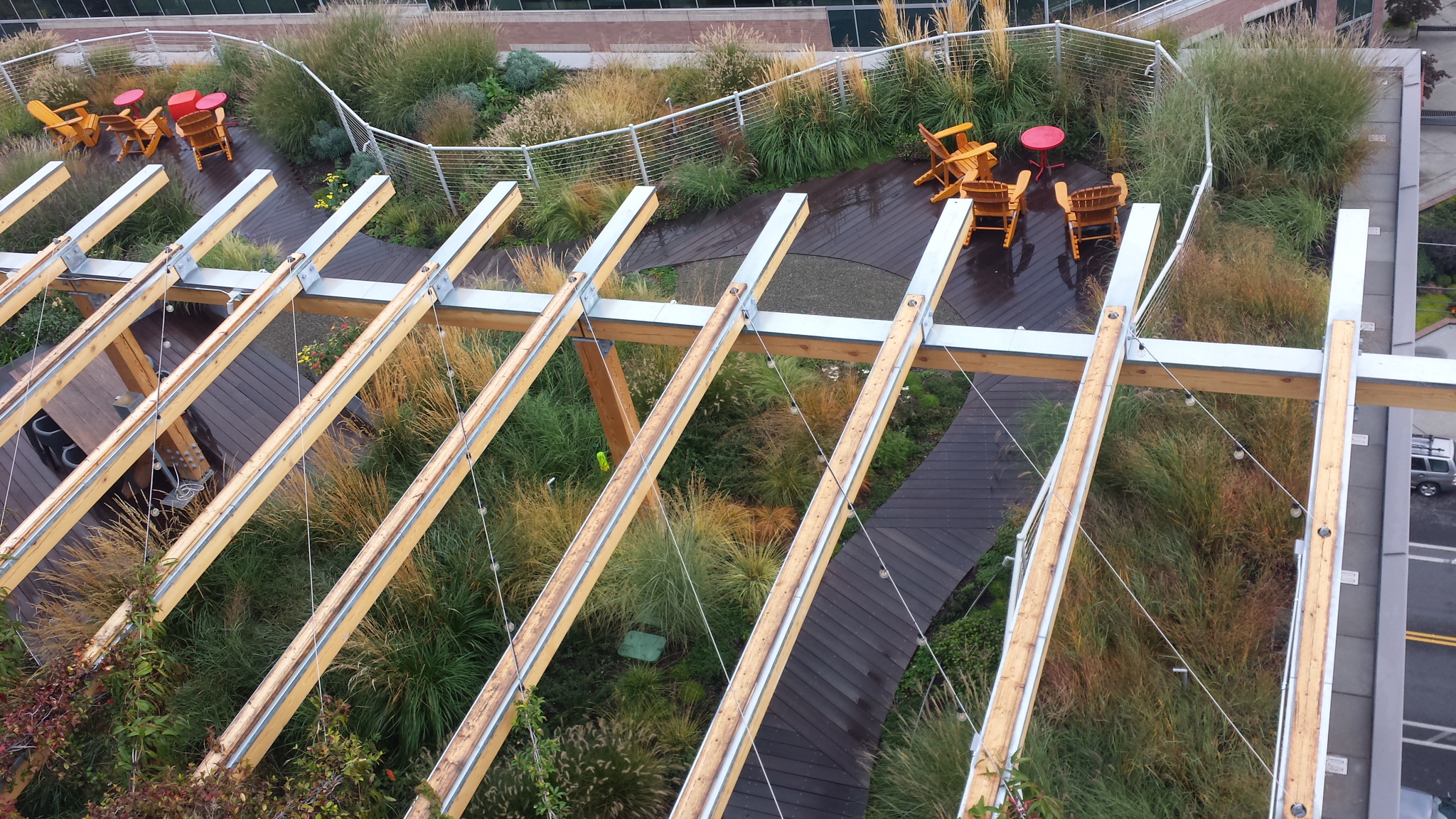 The level 7 roof is a passive space, featuring serpentine boardwalks through beds of native grasses and perennials, a large wooden arbor, fire pit, and beautiful views of the Seattle Skyline. The level 9 roof is a more traditional amenity deck comprised of wood decking and a series of large planters to break up the space.
